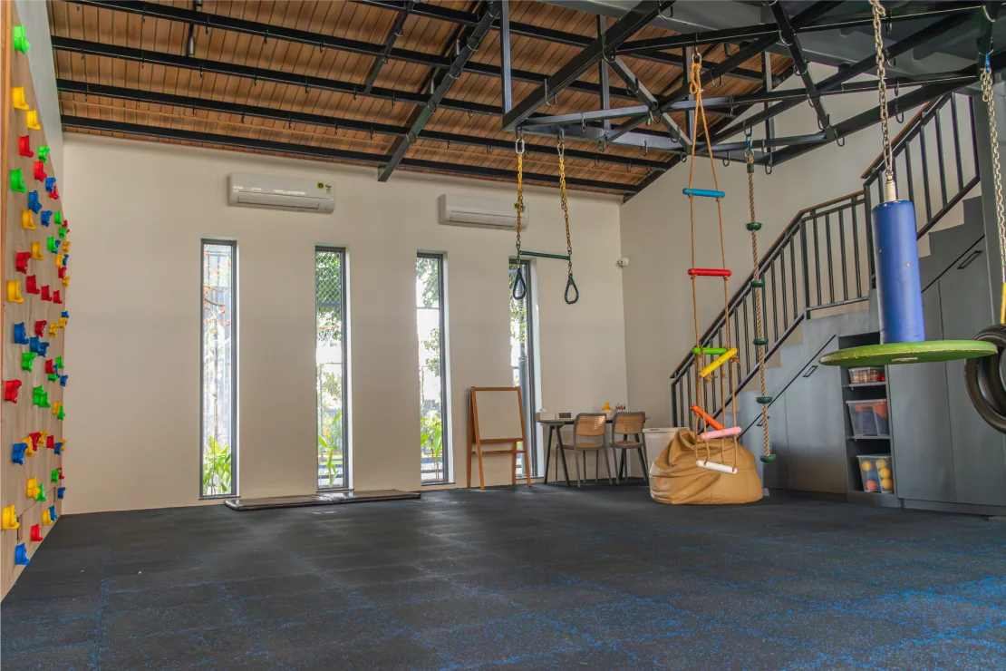 In our Growth Space, occupational therapy takes center stage, providing a nurturing setting for individuals to develop essential life skills, overcome challenges, and achieve their fullest potential. It is in this dynamic room that our iconic rock climbing wall stands—a symbol of resilience and determination. Alongside it, you'll find monkey bars, suspended swings, and an array of materials carefully curated to support diverse needs.