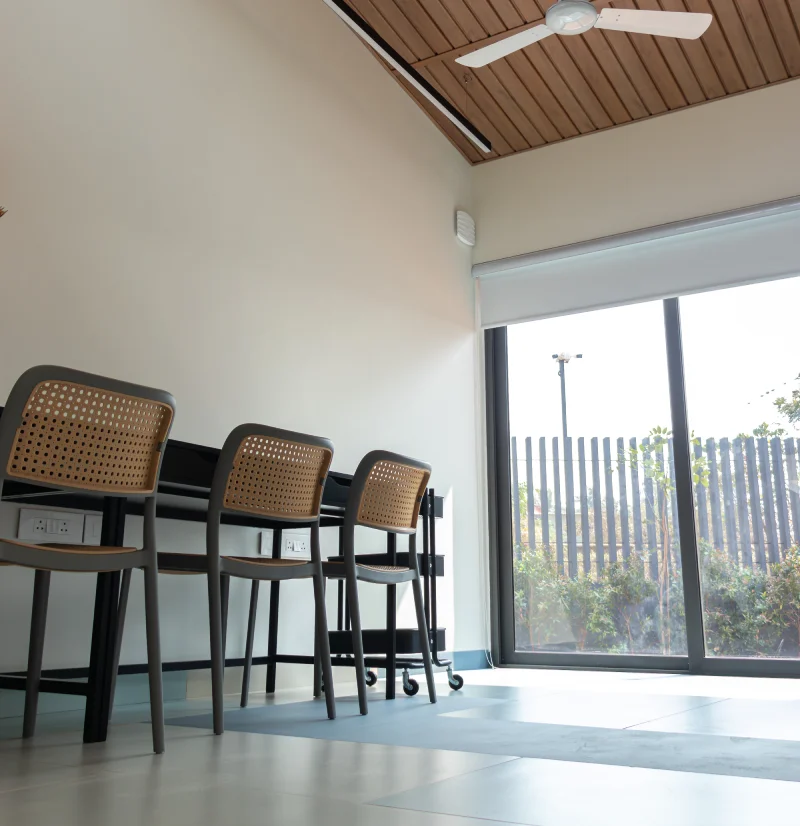 At Soukhya, our space embodies a seamless convergence of innovation, growth, and community. Natural light floods our rooms through expansive floor-to-ceiling windows, offering panoramic views of lush greenery that envelops the surroundings. Our spaces are characterized by a harmonious blend of minimalist elegance and contemporary flair.